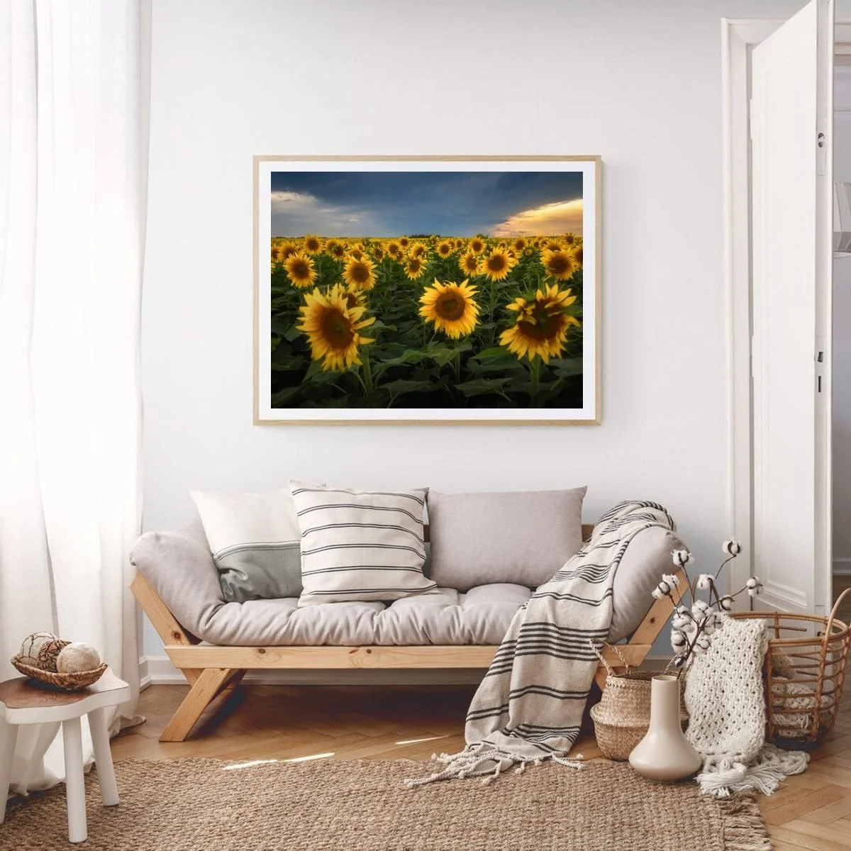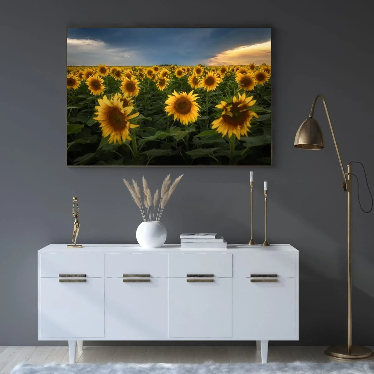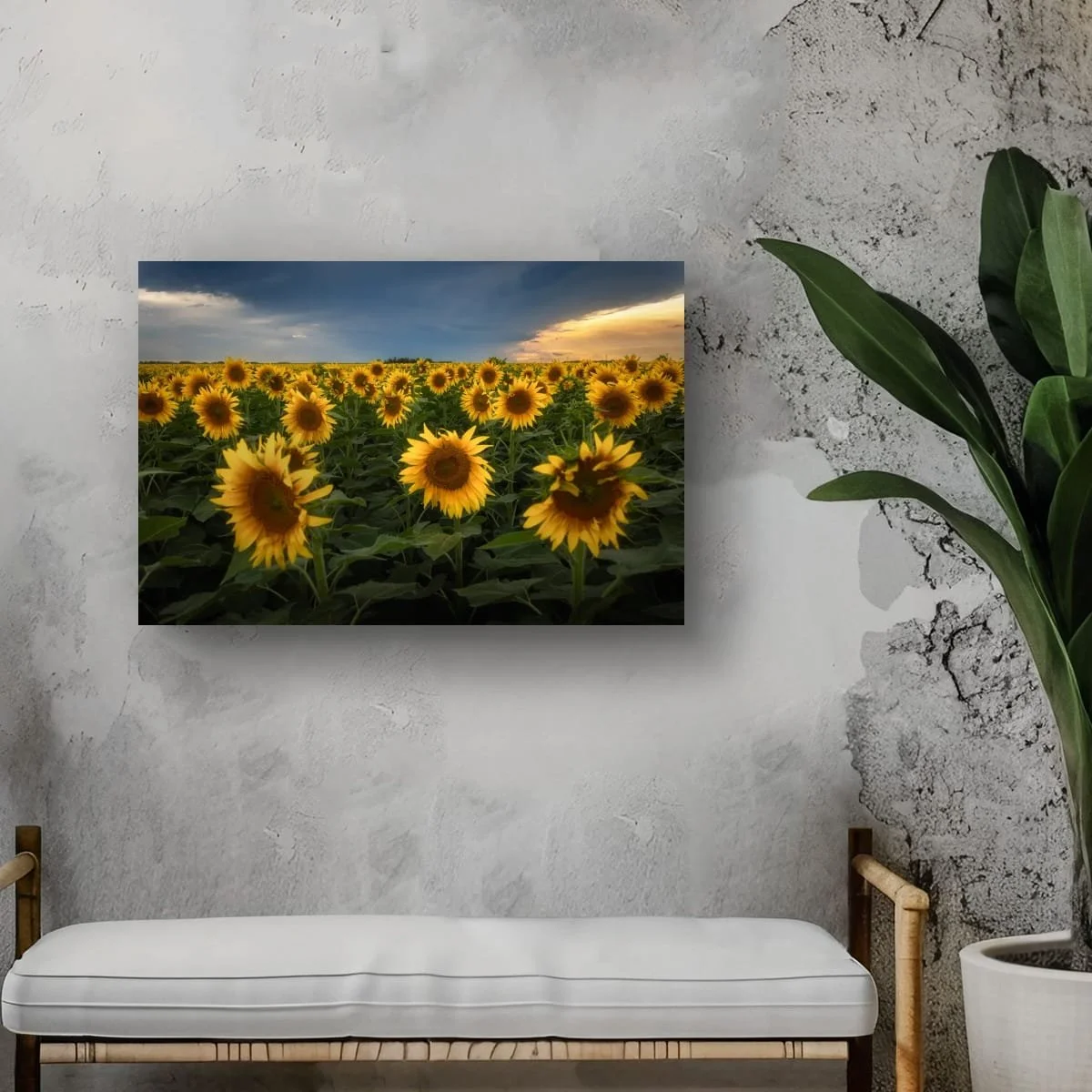 Under a conflicted sky, a field of sunflowers stood quietly, caught between sunset and storm.