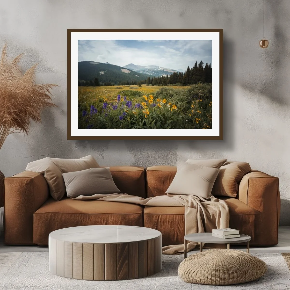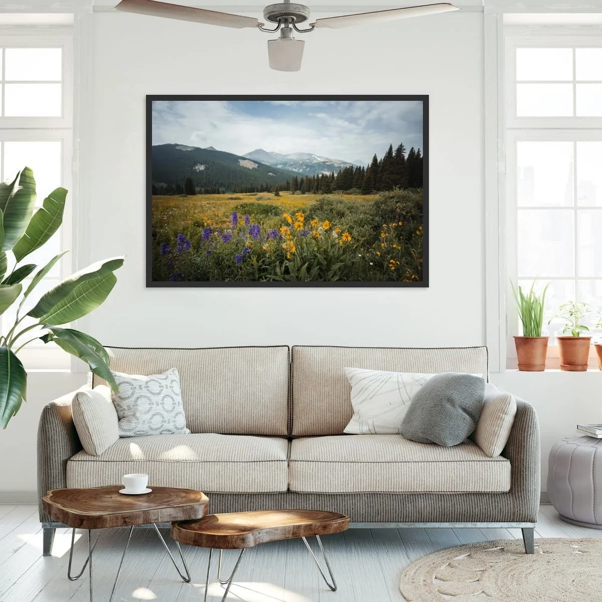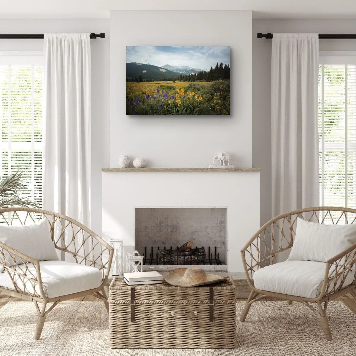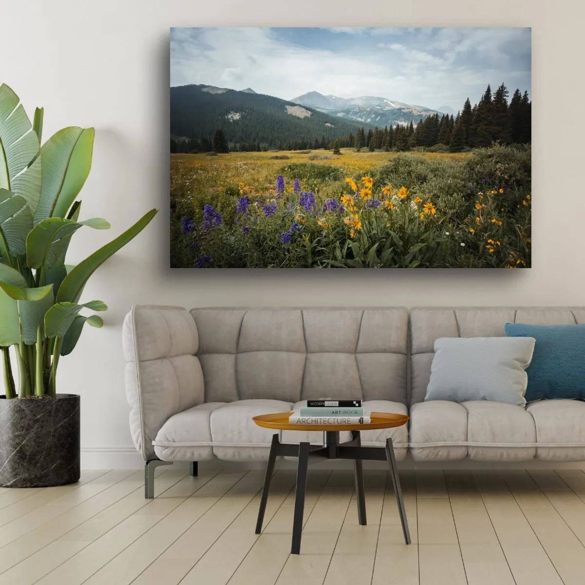 A sweeping view of Boreas Pass in Breckenridge, Colorado, where vibrant yellow and purple wildflowers blanket the alpine meadow under Rocky Mountain peaks.
