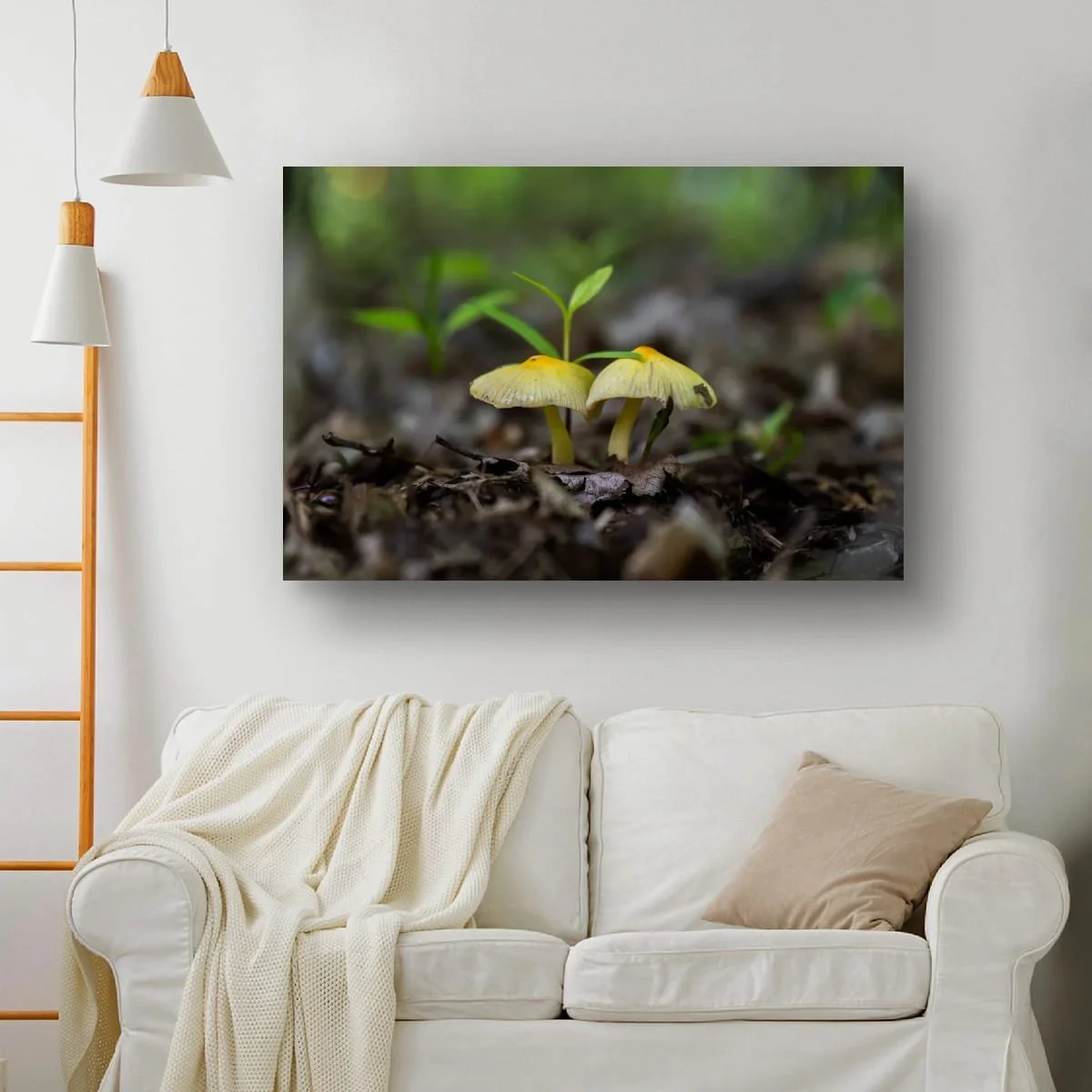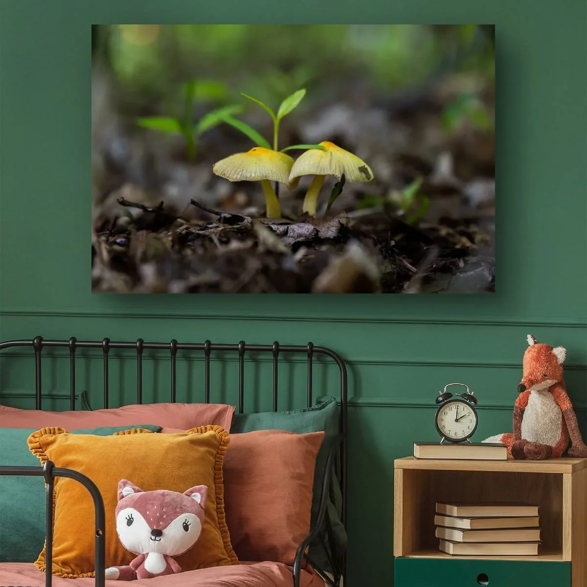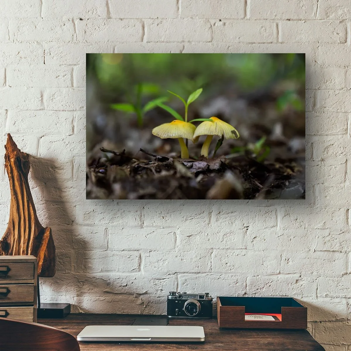 Beneath the towering forest trees, two tiny figures stood side by side. Their caps, golden like sunlight caught in the shadows, leaned ever so slightly toward one another.